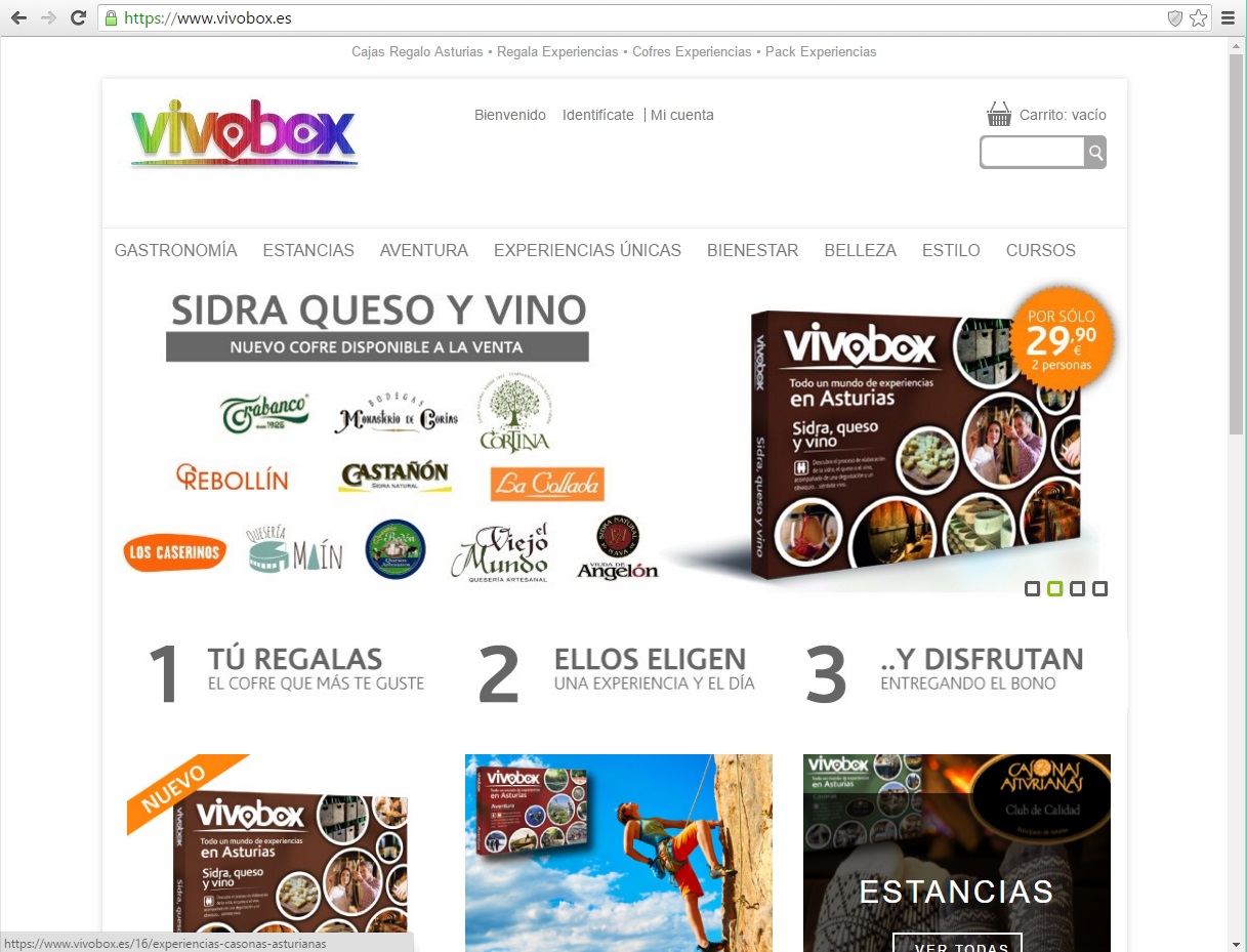 Tienda online de venta de paquetes de experiencias por la geografía asturiana, tales como estancias en casonas rurales, tratamientos de bienestar, belleza, moda, cursos y masterclasses, rutas gastronómicas, sesiones de aventura, o rutas gastronómicas. todas se pueden consultar en https://www.vivobox.es/